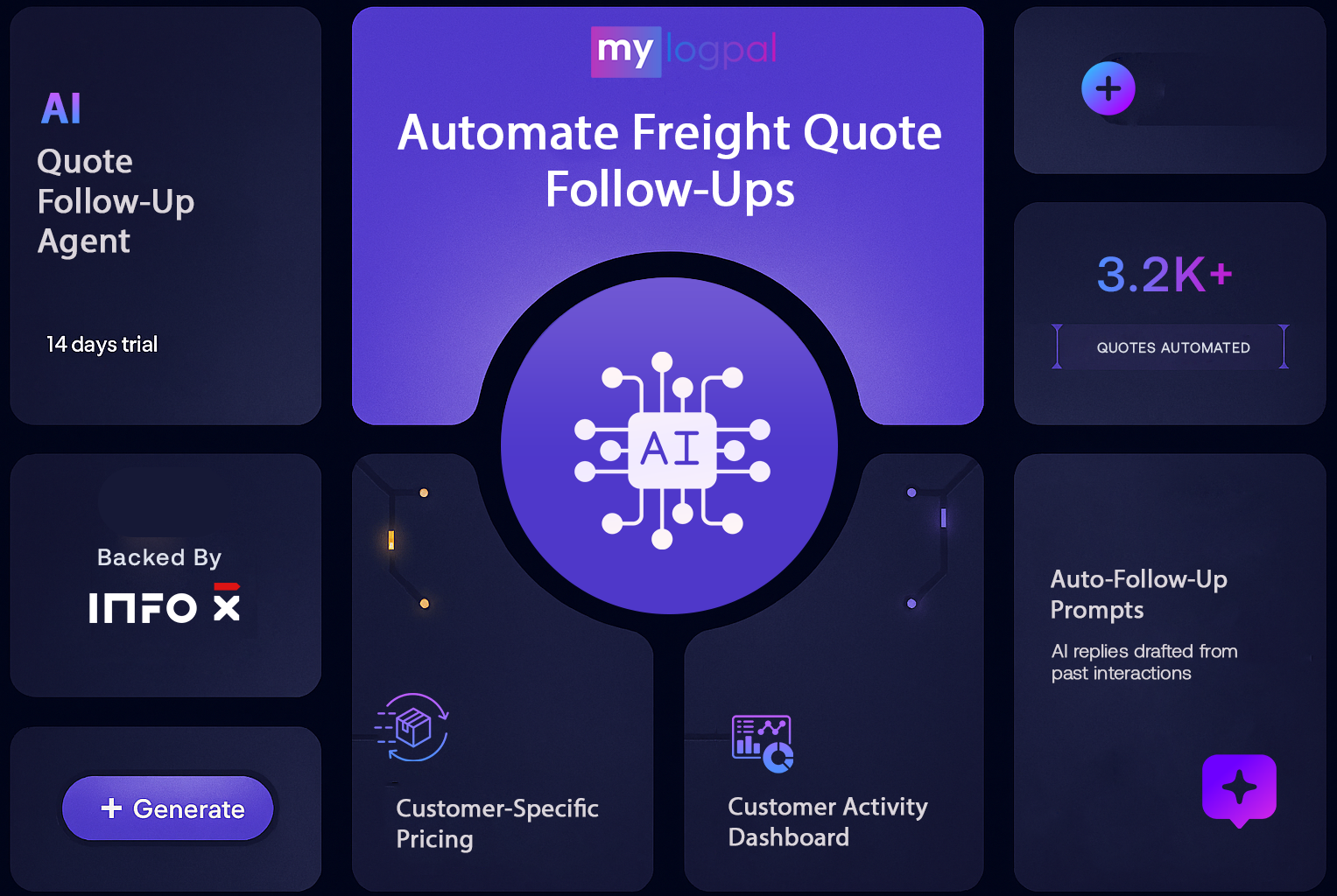 MyLogPal is a logistics-specialized AI engine that automates follow-ups, revives lost quotes, delivers customer-specific pricing insights, and integrates directly with your TMS or ERP — all tailored to your freight workflow.